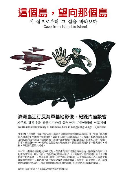 今年8月,我因為一個研究計畫前往韓國,陰錯陽差來到濟州島的江汀村,參加「民族藝術人總連合」舉辦的平和藝術祭、認識了江汀村SOS組織的人、了解江汀村民與海軍工程之間的激烈抗爭歷史。回臺灣後,我便不知不覺地一直回想著江汀的那些人影、吆喝、情事、潮浪聲…………似乎自己對於後冷戰的痛苦、厭惡在這裡找到了一種夾縫中,模糊、卑賤卻具體的共同感。